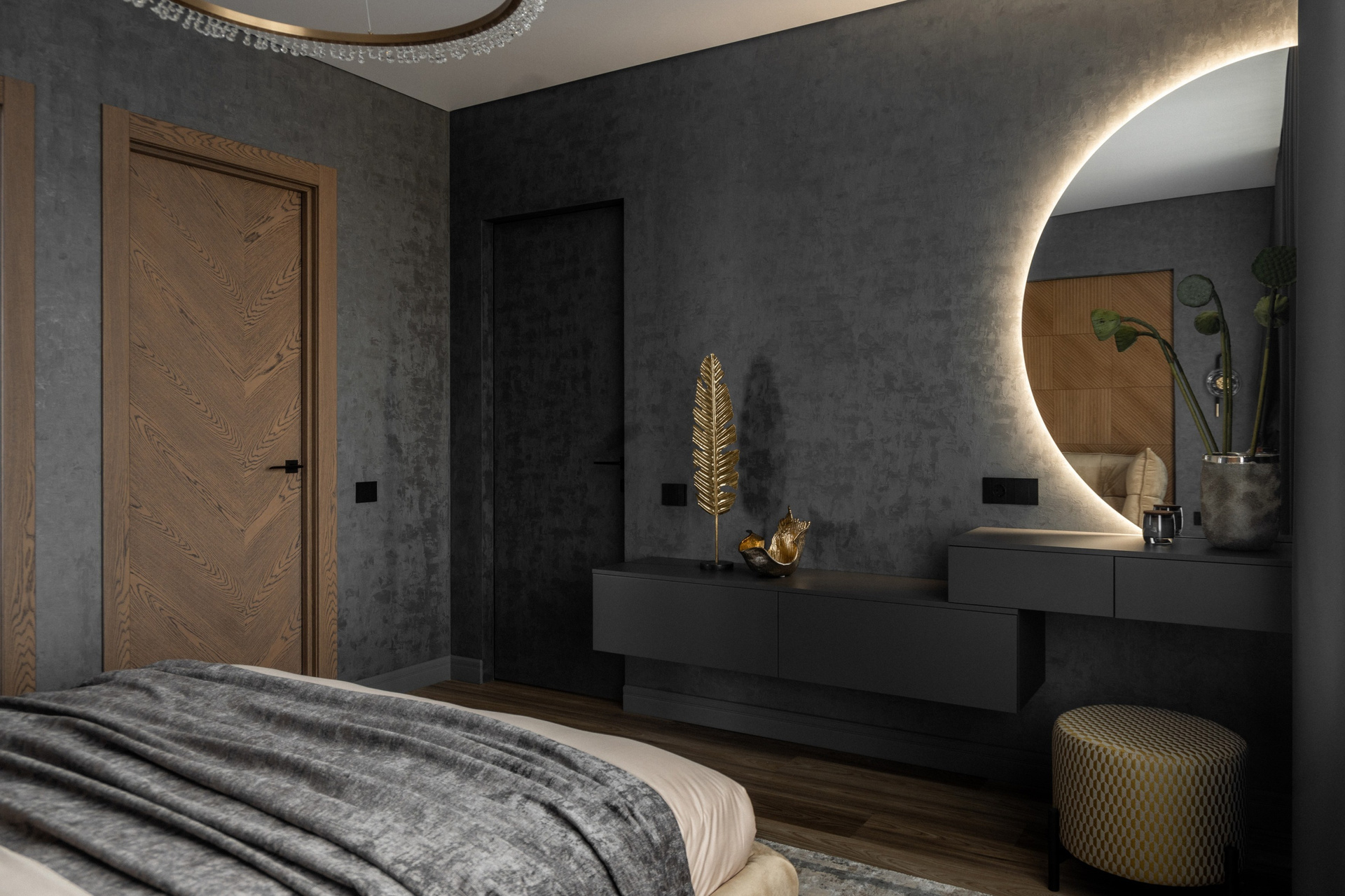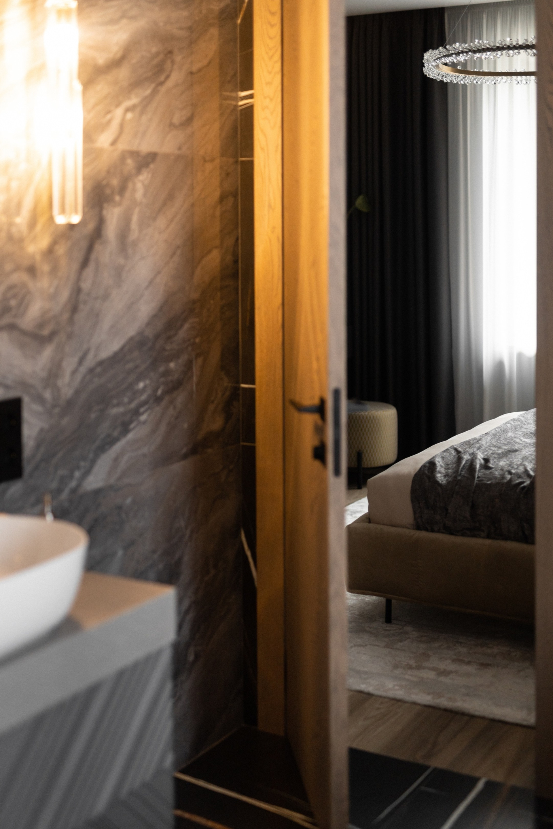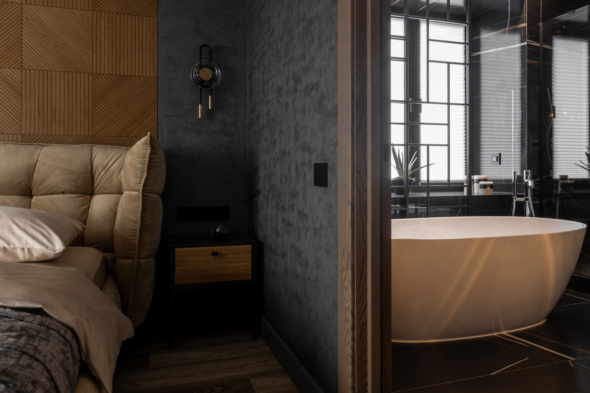 - Функциональная планировка. Объединение спальни, ванной и гардеробной делает пространство более эргономичным.