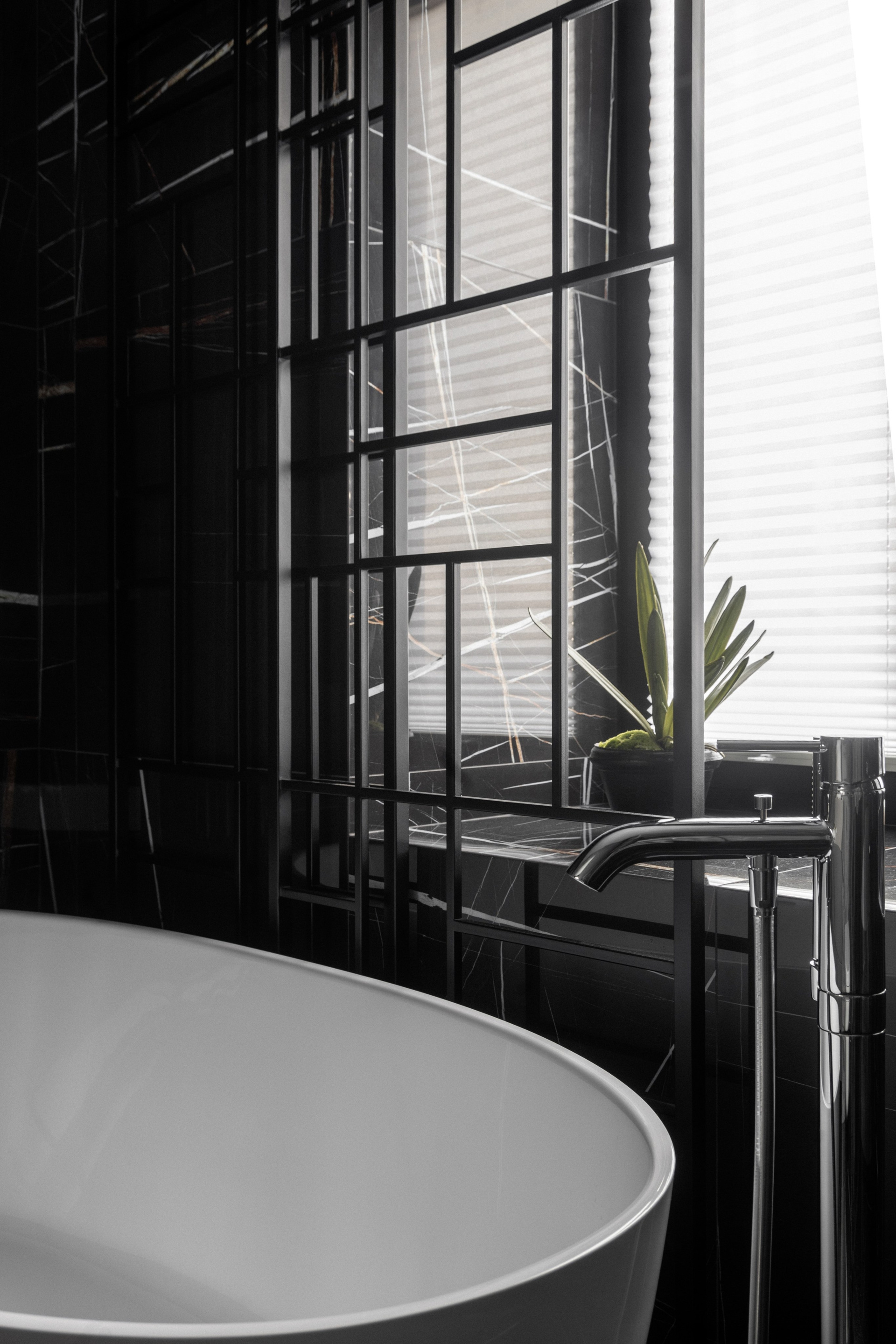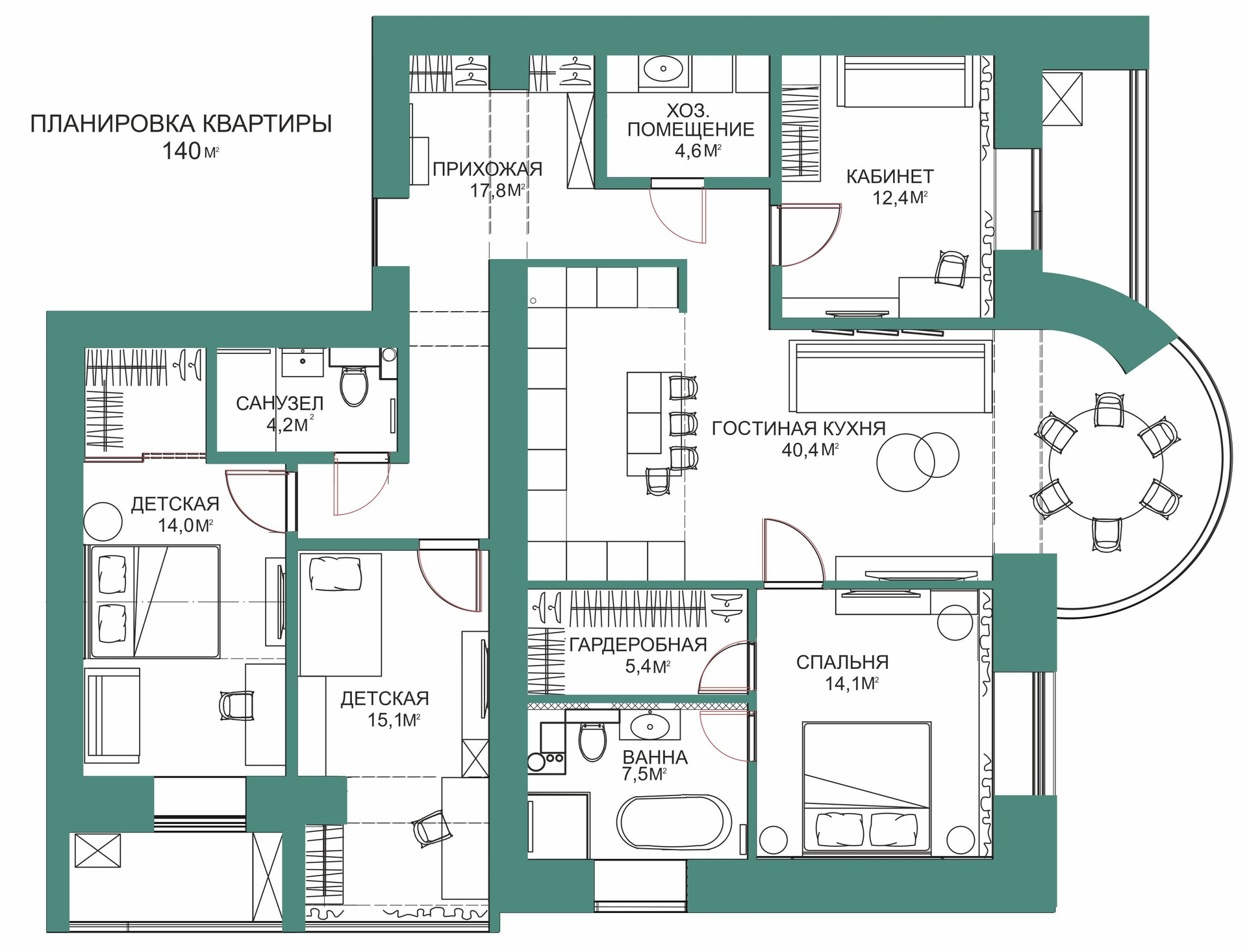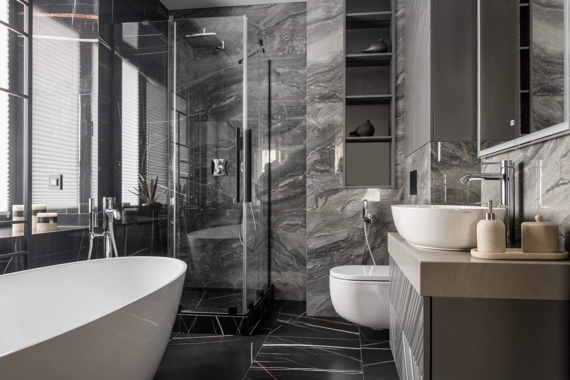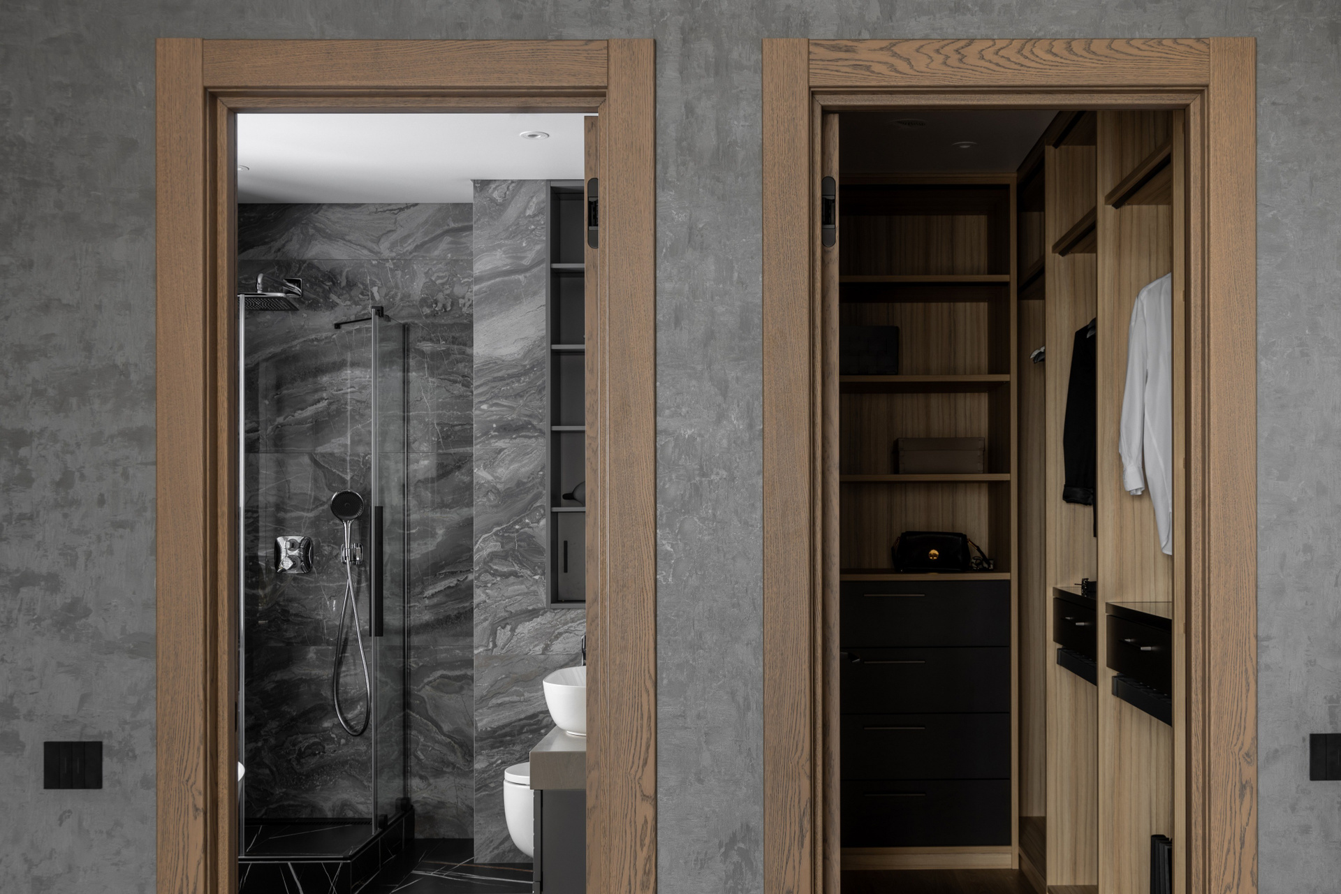 - Функциональная планировка. Объединение спальни, ванной и гардеробной делает пространство более эргономичным.