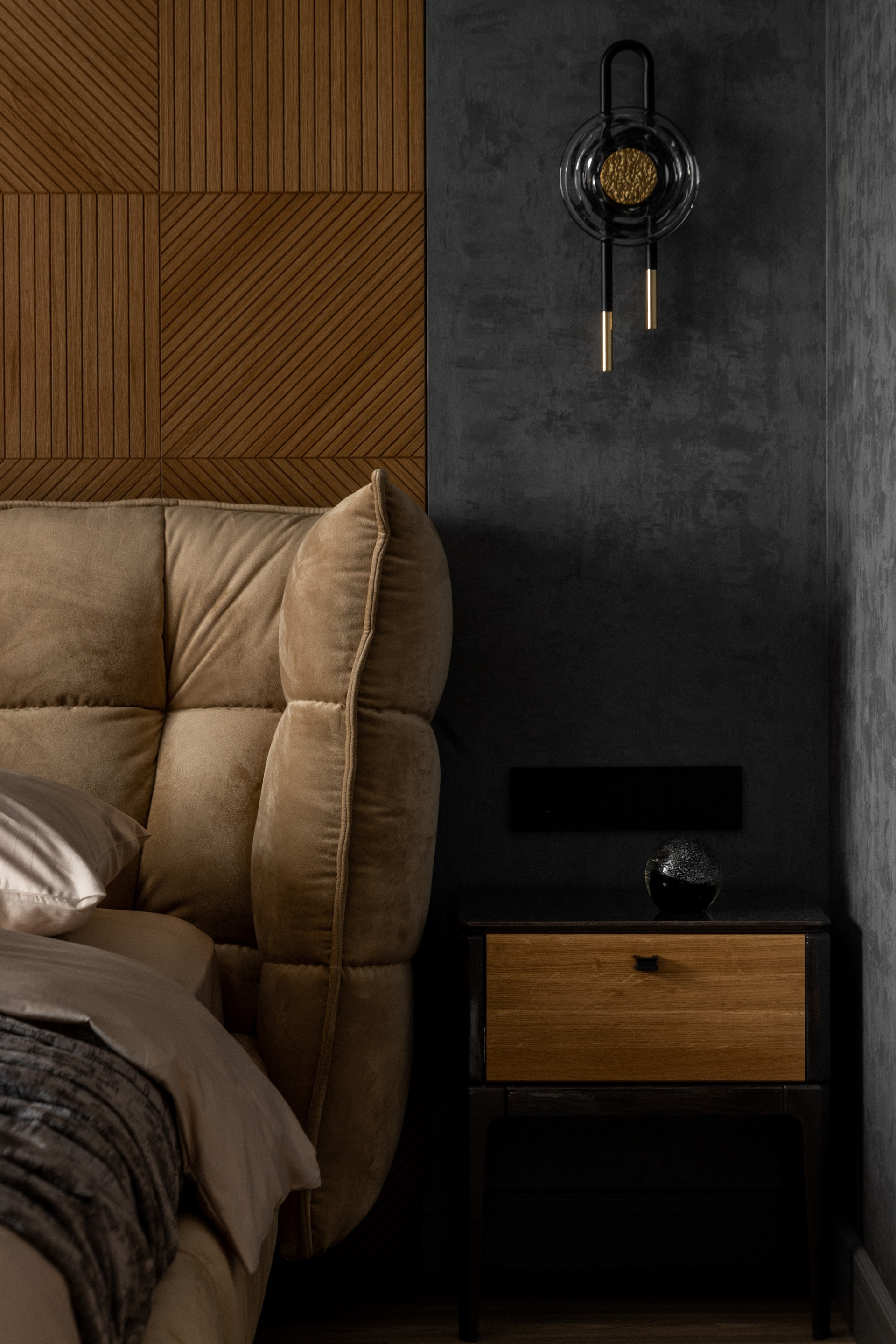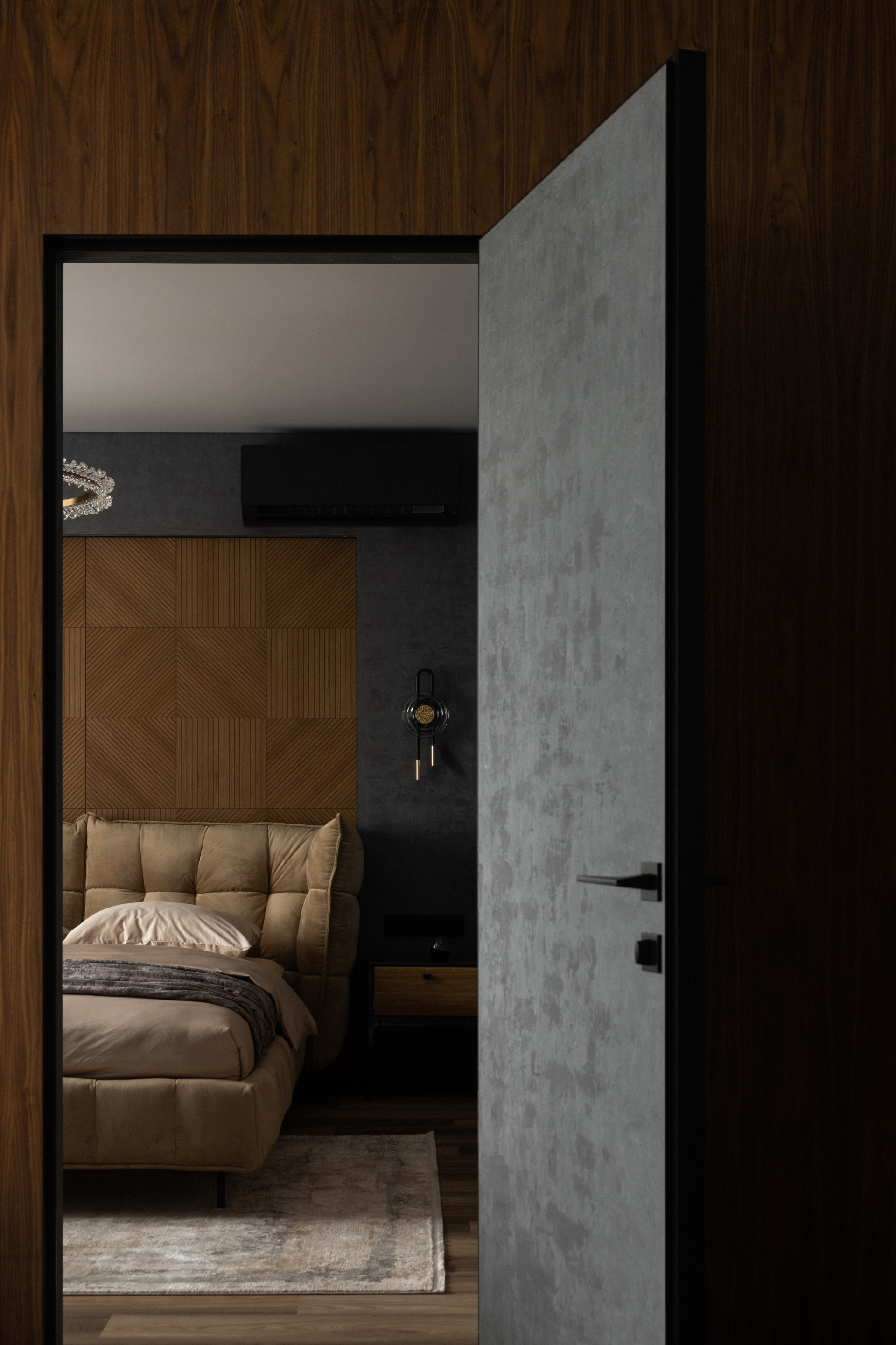 История этого дизайн-проекта началась с простой, но важной идеи — создать для хозяев дома не просто спальню, а полноценное личное пространство, где можно восстановить силы, сохранить уют и побыть наедине друг с другом.